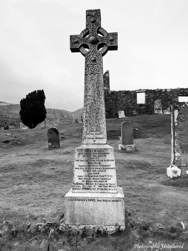 Angus McLeod was born in 1845 and his wife Rebecca née Mckinnon McLeod in 1847. They had three children killed serving in the British & Dominion Forces. Malcolm born in 1878 was killed aged 23 in South Africa during the second Boer War. John born 1886 served with the Cameron Highlanders and was killed at Neuve-Chapelle in 1915. Donald born 1889 (who I assume must have emigrated to Australia before the Great War) joined the AIF and was killed at Villers-Bretonneux in April 1917. The eldest son James born 1874 died in 1947 and is buried at Cill Chriosd. Malcolm, John and Donald lay in some corner of a foreign field that is forever Skye. James wife Christina “Christy” Lamont McLeod was the final burial in the family plot in 1970.