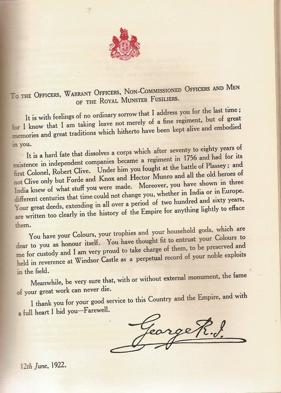 On the establishment of the Irish Free State in 1922, The Royal Munster Fusiliers were disbanded along with the other five Southern Ireland regiments. The Colours of the line battalions were surrendered to King George V for safe keeping. In a letter to the battalion he wrote: