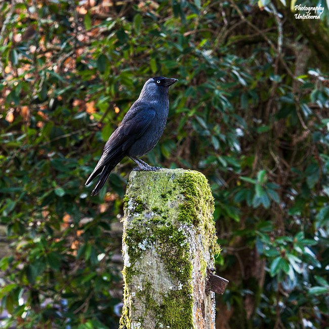 The Jackdaw in the photograph was unquestionably vain: for he posed upon his perch for some time. Contrasting against their black plumage, the eyes of the Jackdaw are striking. Recent research has revealed that Jackdaws use their pale irides to communicate. Watching the Jackdaws, it is obvious how competitive their struggle for life is. And evidence suggests in this competitive struggle; Jackdaws, use salient eyes to ward off other Jackdaws and avoid conflict. Jackdaws are shown to be sensitive to eye gaze direction in humans by delaying their approach to food when an unfamiliar human is looking towards them: Source.