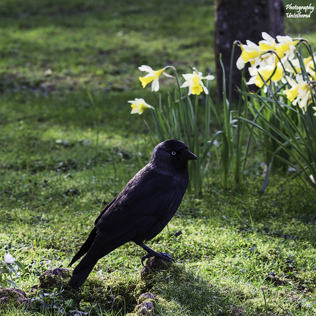 Occupying a tranquil area between St. Oswald’s churchyard in Grasmere and the River Rothay, lies the Wordsworth Memorial Daffodil Garden. One quiet, beautiful March day, I rested upon a bench, silently admiring the yellow carpet of flowers. Before long, Jackdaws swooped down to take advantage of the sea salt crunchion crumbs dropped by my daughter. Soon a flock of Jackdaws filled the daffodil swept lawn and trotted to and fro in anticipation of food.